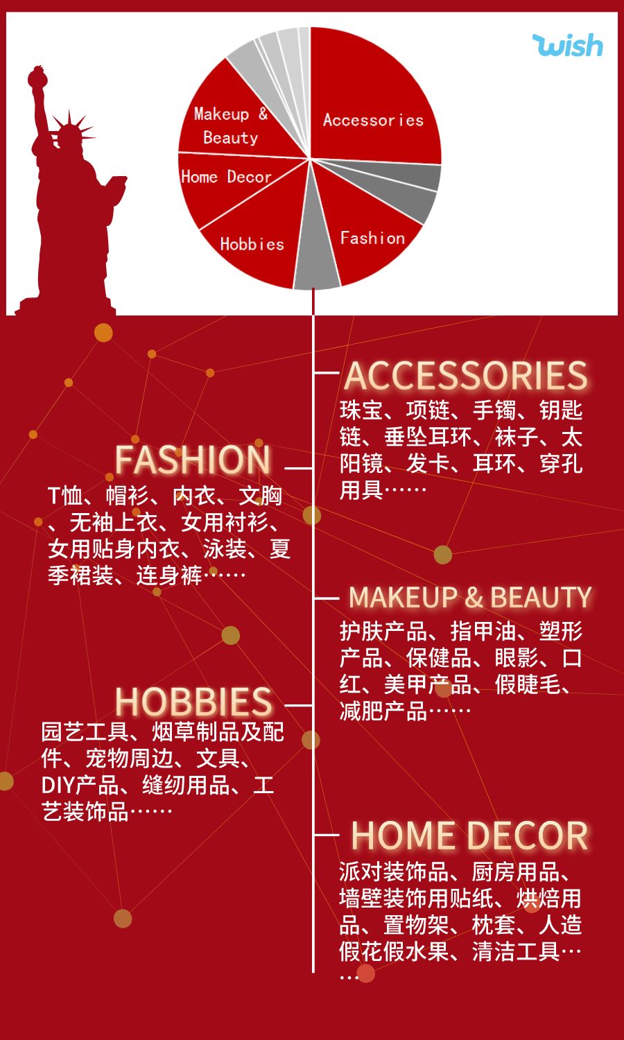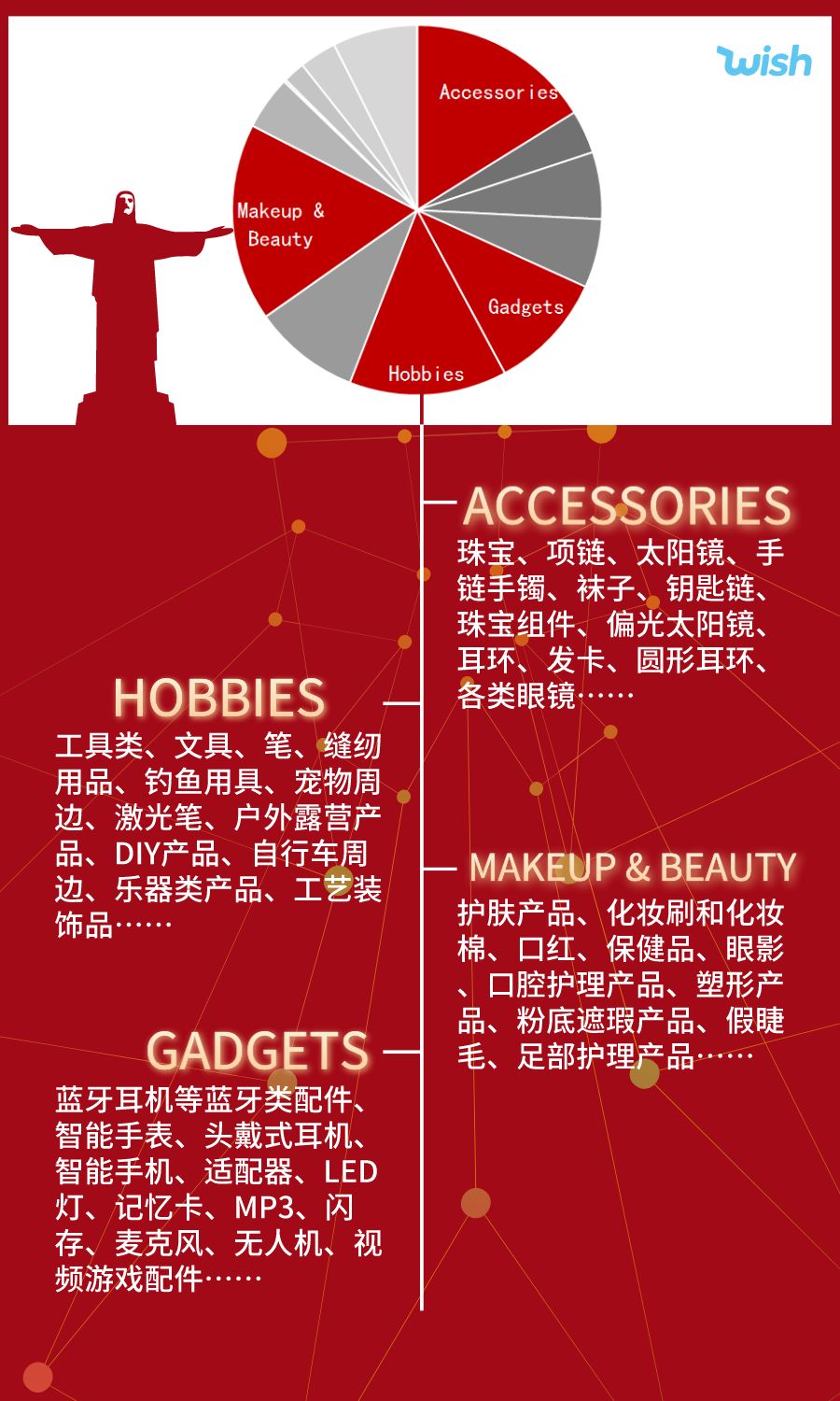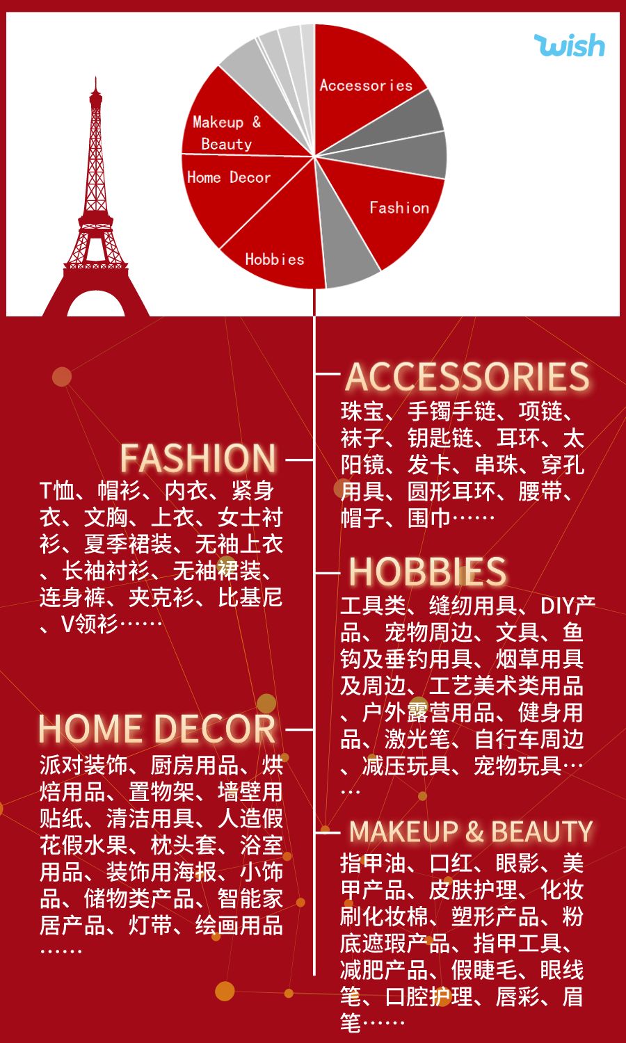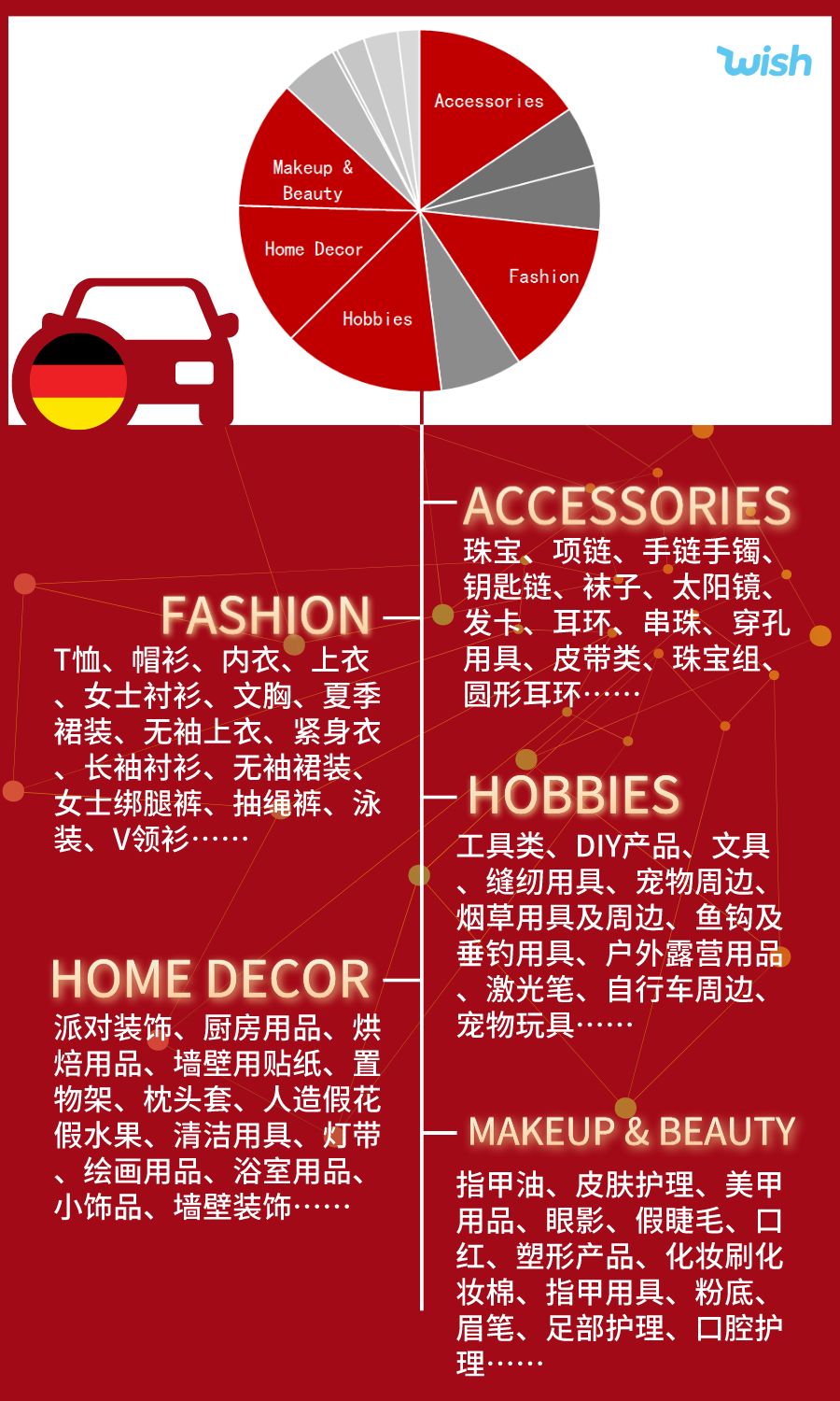 2020年开始啦!小编已经闻到了春天的味道~北半球准备迎接春天,南半球将要进入秋冬,这个春天(北半球的~~)又有哪些不同?潘通年度色彩是经典蓝,大面积印花的时尚风潮好像又吹回来了……时尚果然是个圈,每个设计都有自己的春天~时尚在轮回,每年2月至4月,Wish平台上的热销产品也在循环,几个主要国家(或地区)市场上的热销产品都那么地相似。纵观2019年春季的全球市场,配件配饰、时尚服装、家居用品、美妆个护、兴趣爱好、3C电子依然是销量最多的品类,而对于美国、德国、法国、英国、巴西等几个重要的Wish市场,热卖产品的默契度相当高!尤其是美国、德国、法国、英国四个国家,各个重点品类中的热卖品类几乎完全相同。在配件配饰品类中,珠宝、项链、手镯、耳环、袜子、太阳镜等是所有主要国家市场中销售量最多的产品,没有例外。而2019年2月至4月,美国市场上的配件配饰类产品的销量占到总销量的1/4以上,2020年的春天,配件类产品是否还会这么火爆?包括美国、法国、德国、英国在内的美欧主要国家,内衣及春夏装都是2019年春季的热销品类;同时,家居家装类产品也是春季的热门品类:派对装饰、墙壁装饰、人造假花等产品都是几个主要国家春季的热销产品;美妆个护产品属于无明显季节性的日用品,眼影、唇膏、假睫毛、粉饼遮瑕、指甲油……这些常用的产品依然是2020年春季的潜在热卖品类。
