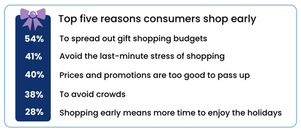 “提前购物”依然受到欢迎,42%的消费者在11月前开始浏览或购买节日商品,主要原因是为了分散预算、避开人流高峰、抢先享受优惠等。即使如此,63%的消费者会在感恩节周末完成大部分购物,多数人(60%)将在12月完成全部采购。
