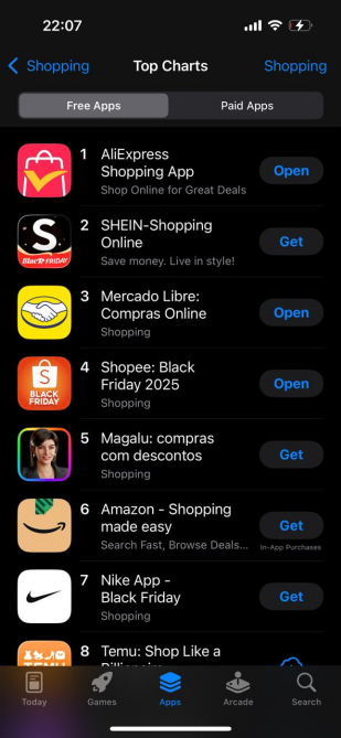 记者获悉,11月11日海外双11开售当天,速卖通巴西站创下2013年开站以来单日成交最高纪录,并于11月17日超越亚马逊、Temu、美客多等一众购物平台,登顶苹果App Store巴西购物类应用榜首。