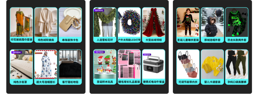 从商品维度看,全托管模式在多品类布局上也成效显著,秋冬服饰、家居及节庆用品等核心货品GMV爆发超 200%。平台在女装、男装、运动、箱包及母婴等重点类目中精准打造爆款:从满足日常穿搭的垂感毛衣、卫裤,到契合季节和场景需求的可外穿家居服、滑雪服,再到具备节庆送礼属性的圣诞托特包与儿童睡衣,均成为拉动增长的核心引擎。各品类爆款的集中涌现,不仅体现了全托管模式下的精准选品能力,更彰显了平台快速响应市场的成熟供应链体系。