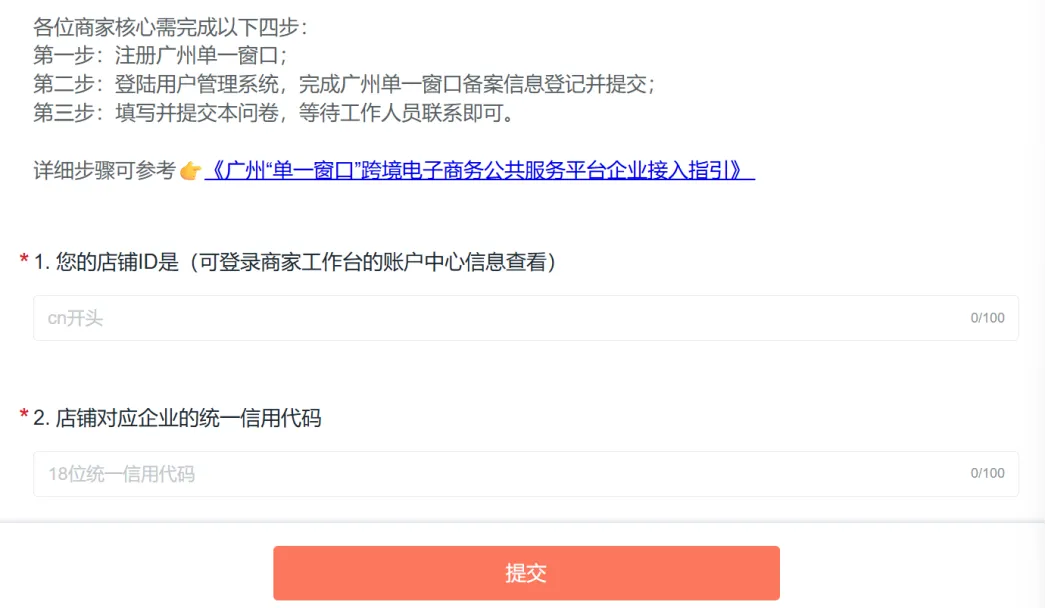 参加试点的卖家需填写相关资料,包括店铺ID、店铺所对应企业的统一信用代码,具体步骤可参照《广州“单一窗口”跨境电子商务公共服务平台企业接入指引》。