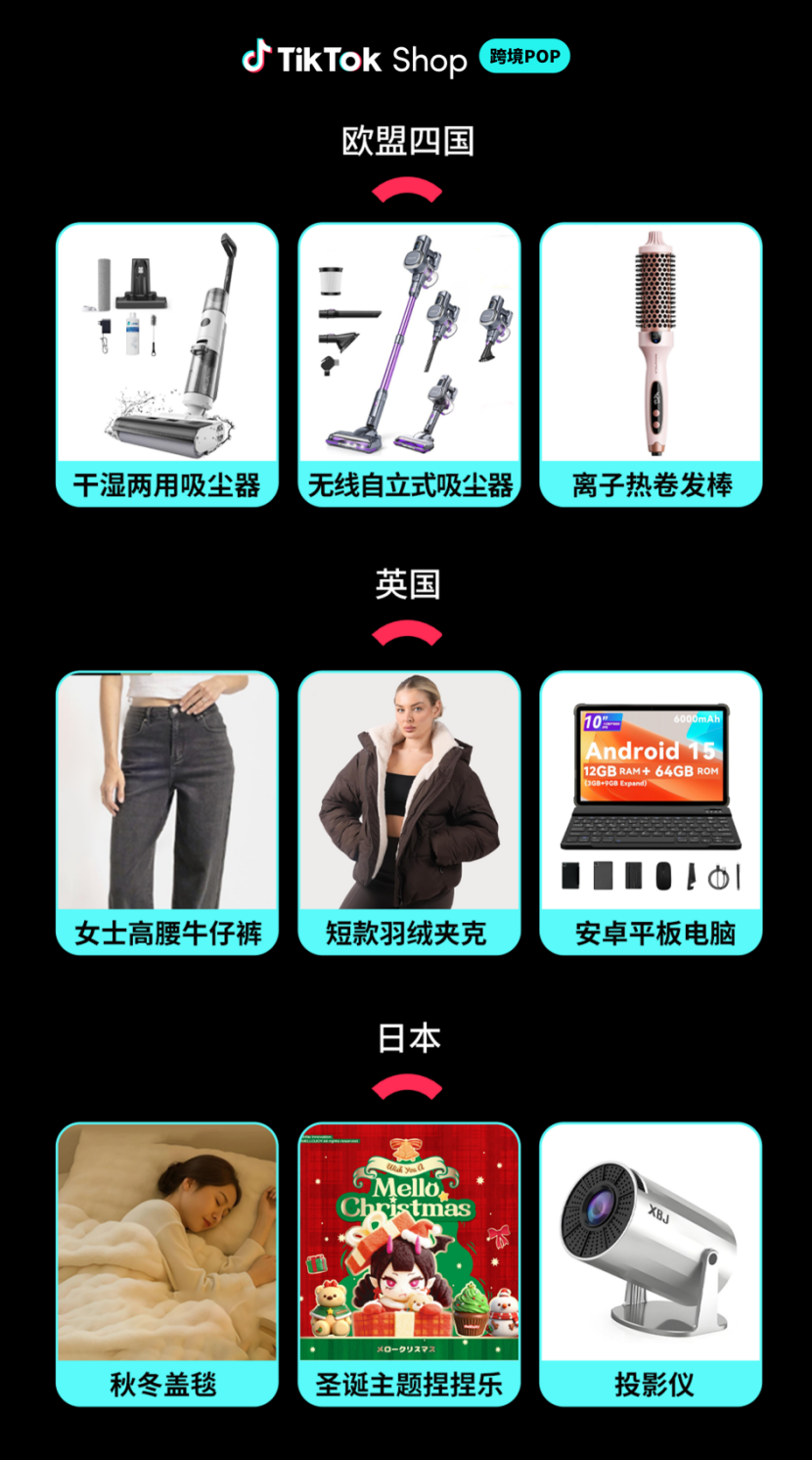 在英国、欧盟四国和日本,“全球黑五”期间 TikTok Shop 跨境POP的整体 GMV 相比年中实现多倍增长:其中英国市场GMV 爆发184%,欧盟四国GMV爆发224%,日本市场GMV爆发151%;超过 20 个品牌在美区卖爆之后,在欧洲、日本的生意提升超 200%。