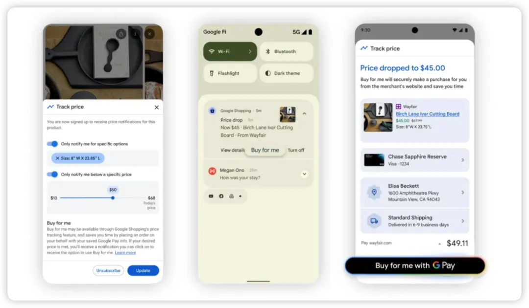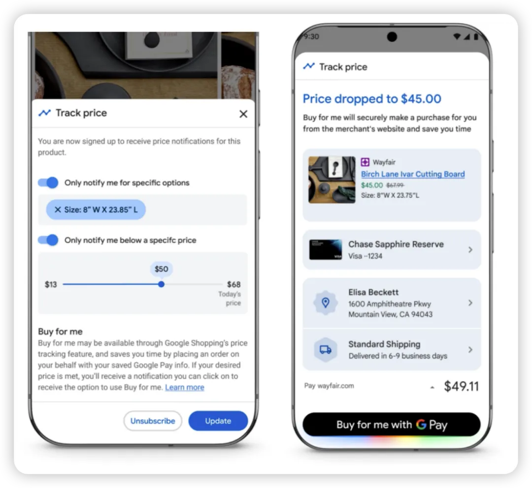 此外,用户可以让Gemini帮忙“持续追踪产品的价格”,以免因产品降价而错过购买时机。例如,用户要购买一个砧板,可以先设置砧板的尺寸(8*25英寸)和价格区间(13-50美元),当该产品的价格达到用户的期望值(比如45美元),Gemini就会通知用户下单。
