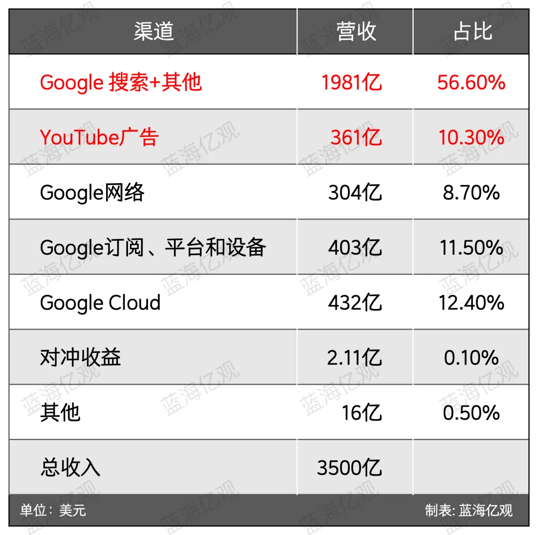 谷歌的核心收入来源是广告(包括“购物广告”),2024年,谷歌母公司Alphabet总营收3500亿美元,其中,来自搜索与Youtube的广告收入,合计占比约66.9%。