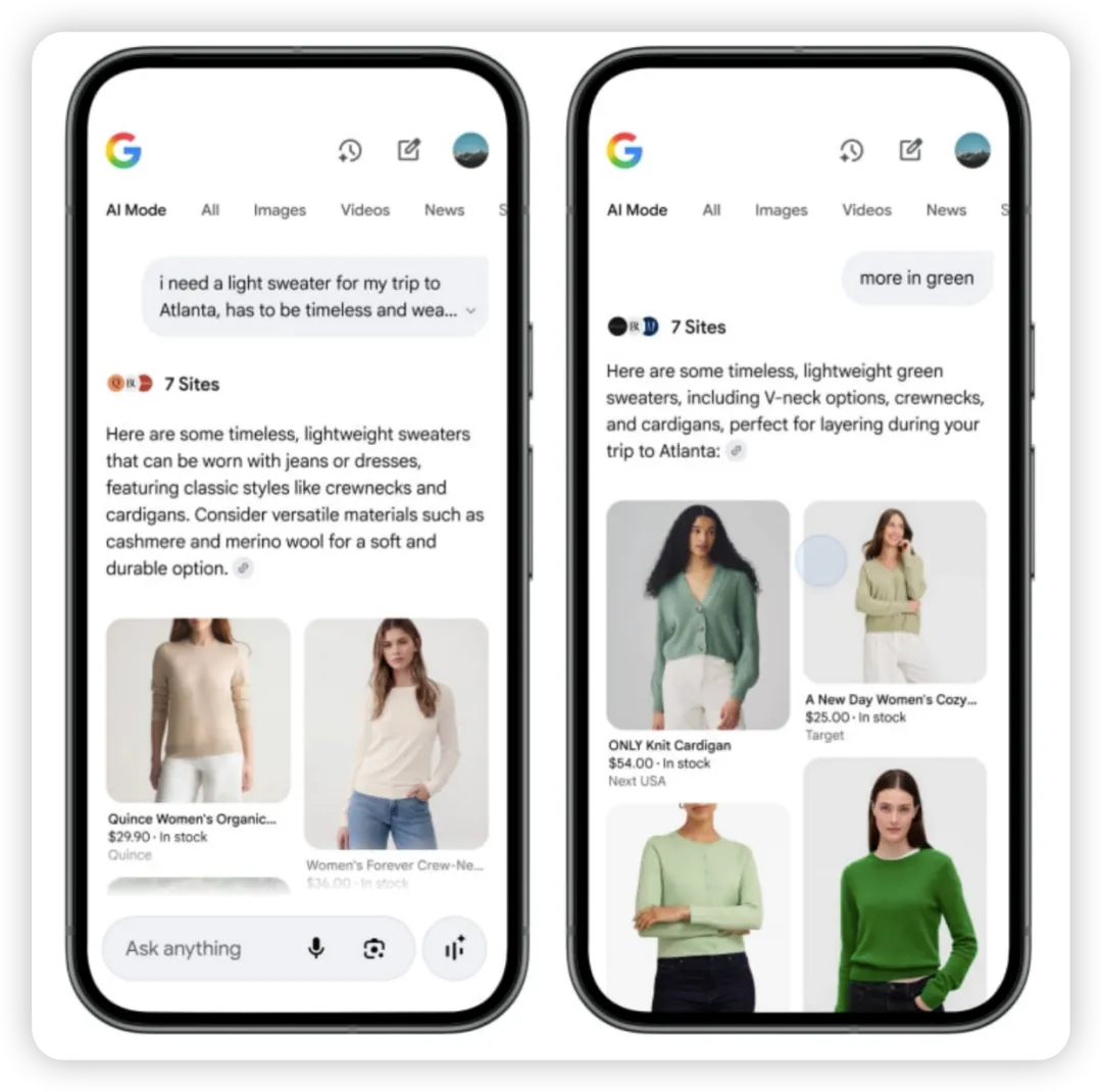 例如,美国用户在Gemini对话框内提出“我去亚特兰大旅行,需要购买一件轻薄、经典、百搭款的毛衣,并且能搭配牛仔裤和连衣裙”,Gemini就能推荐出各种品牌的毛衣,用户还能根据提示,在结果页中不断完善购物需求,比如继续提出“更多的绿色款式”等需求。