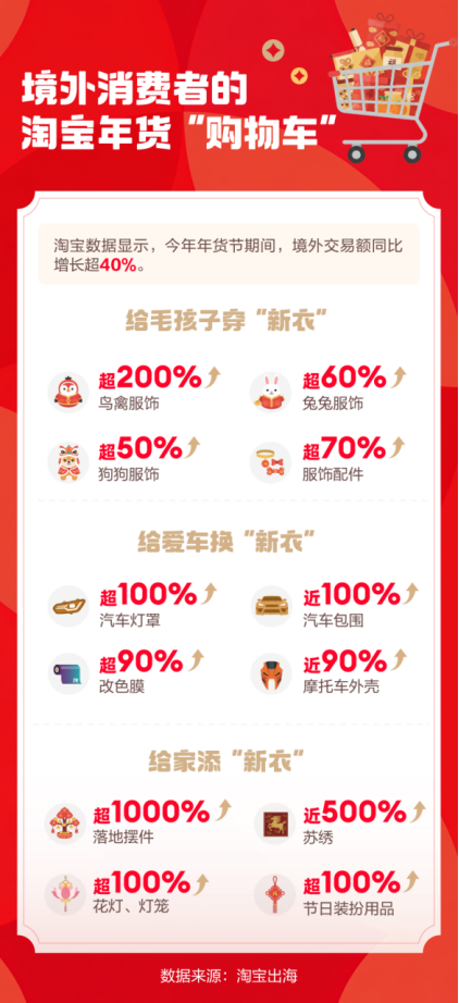 今年年货节期间,淘宝境外交易额较去年增长超40%,中国新年文化的全球影响持续扩大。在国内,“新年穿新衣”是不可或缺的过年仪式感,在境外,这一传统也扩大到了家居装饰和给宠物、爱车穿“新衣”上。淘宝数据显示,狗、兔子、鸟禽等宠物服饰,汽车、摩托车配饰,家居摆件、大件家具等行业在境外成交都迎来了爆发式增长。