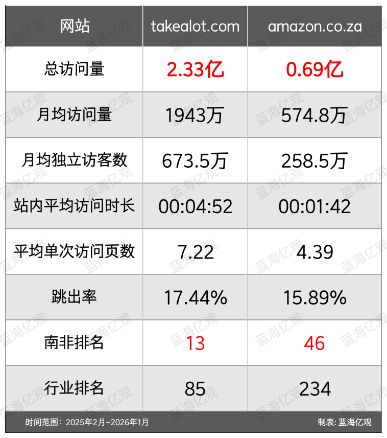 近一年(2025年2月-2026年1月),Takealot吸引了约2.33亿的访问用户,超过亚马逊南非站点(访问量约0.69亿)。