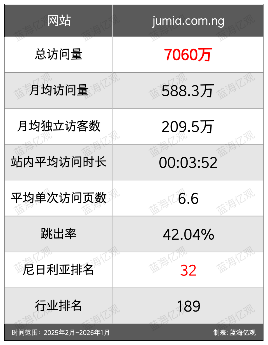 从流量规模来看,尼日利亚是Jumia在非洲最重要的站点之一。近一年(2025年2月-2026年1月),该站点吸引了约7060万的用户。