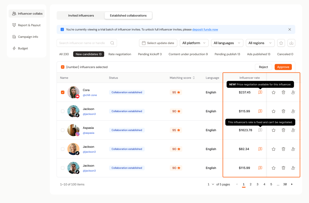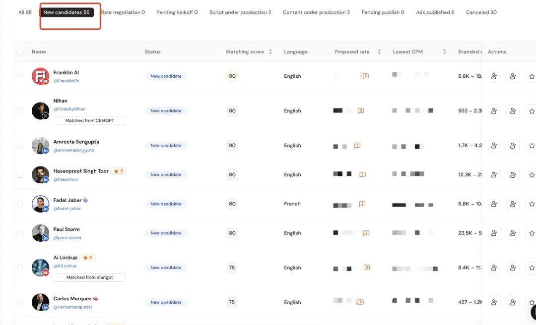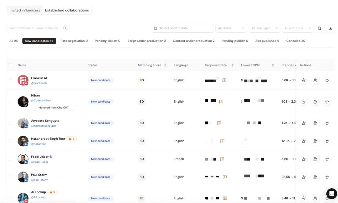第二是“乱”,当合作达人从10个变成50个、100 个乃至更多时,大量信息分散到私信和表格之中,很容易出现混乱:发了几封邮件、谁还没回复、谁在谈价阶段、谁收到了样品、谁延期、谁交稿不符合要求,等等,如果依赖人工记忆、表格和零散沟通,很容易产生遗漏与延误;