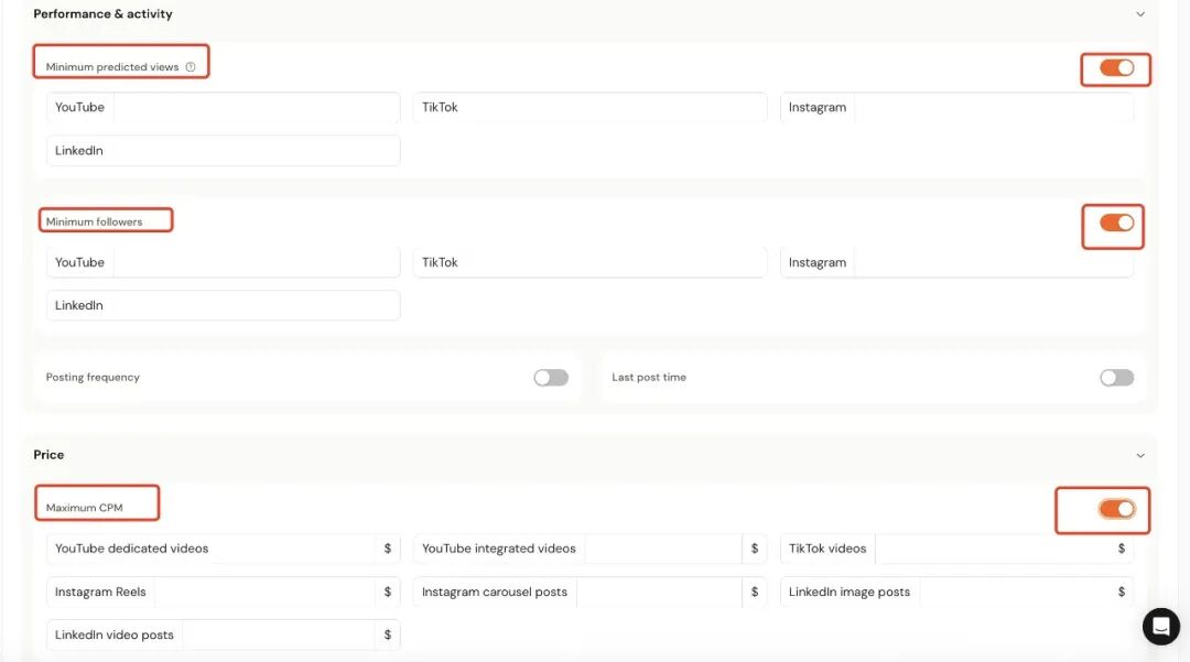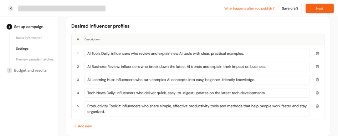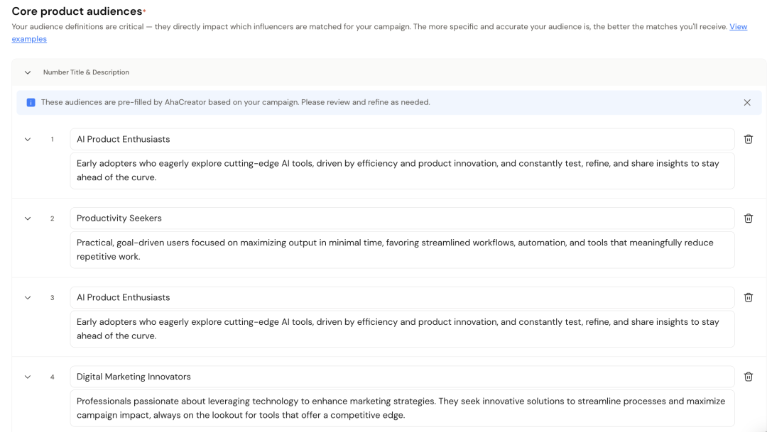 AhaCreator抓取、分析大量可能匹配的达人之后,还会生成“达人画像”(desired influencer prolifes)。我们可以挨个“批阅”,也可以挨个“修改”。此外,也可以进一步上传材料(非必选),提出非常细分的需求,例如,达人黑名单、品牌规范、最低浏览量、最低粉丝数等,以进一步匹配到自己想要的达人。