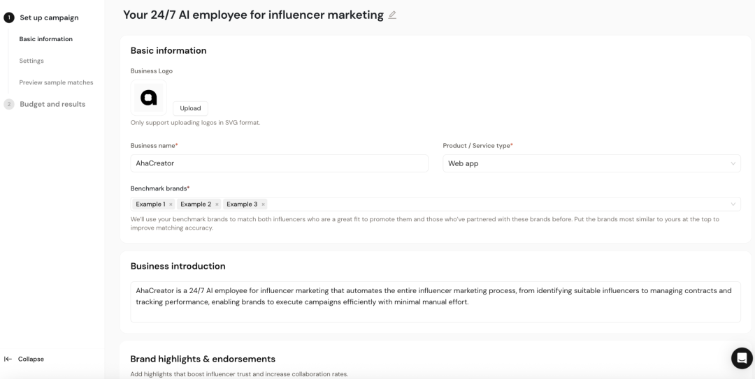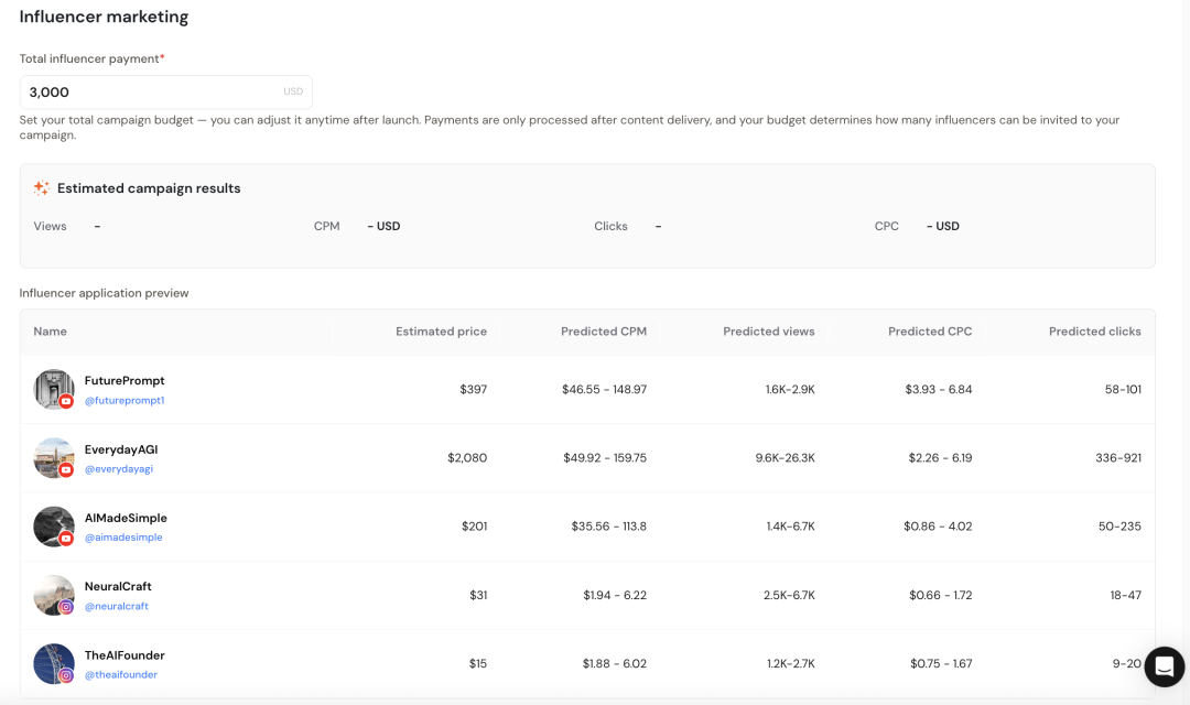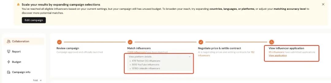 接着,我们设置预算,给出具体的金额。设置好预算后,Campaign 就正式开启了。然后,AhaCreator会花费大概24-48小时的时间去找人。