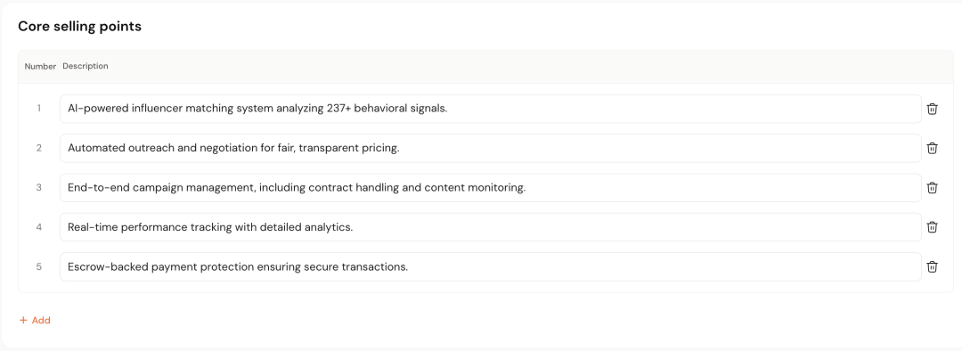 其次,AhaCreator依托AI 大模型主导的达人匹配系统(LLM Expert-Led Influencer Matching System),深刻理解了「什么产品× 什么达人」更有效。品牌方只要一键输入自己的产品详情页,AI就会挖掘出每一个品牌独特的调性、优劣势、产品卖点等,然后基于多种指标(目标受众、内容风格、达人粉丝量、播放量、目标市场国家等),通过召回、粗排、精排的多阶段漏斗,“量身定制”地为其匹配“适合的达人”。