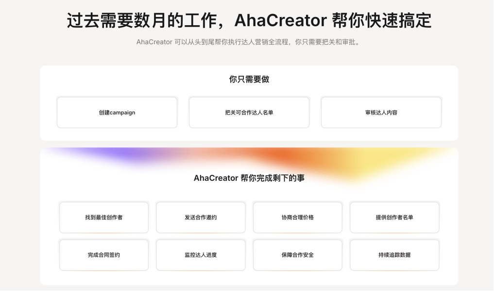 AhaCreator 致力于在本质上改变达人营销“堆人力+堆时间”的既有格局,把过往的“人类全程参与策略、执行、跟进、复盘”的模式,转变为“人类做判断+AI规模化执行”的高效模式:让AI对接数量庞大的达人,接管最耗人力、最难规模化的执行环节(找人、建联、谈价格、信息收集、催稿、素材授权、数据回收等)。