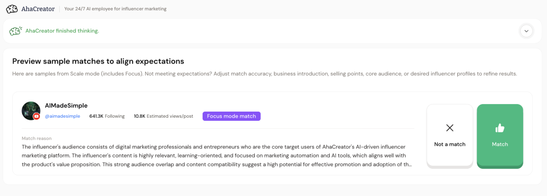 第三步是匹配。完成以上设置后,AhaCreator会根据上面设置的信息,给出几个“达人示例”,我们可以点进主页,去看达人是不是符合我们预期。如果对这个匹配结果满意,可以选择:「Match」。如果不符合预期,可以选择:「Not a match」。这一步,就是品牌方进行“人工介入”,对AI匹配出来结果进行反馈,相当于对AI实施进一步的训练,这样才能让它匹配出更符合心意的达人。
