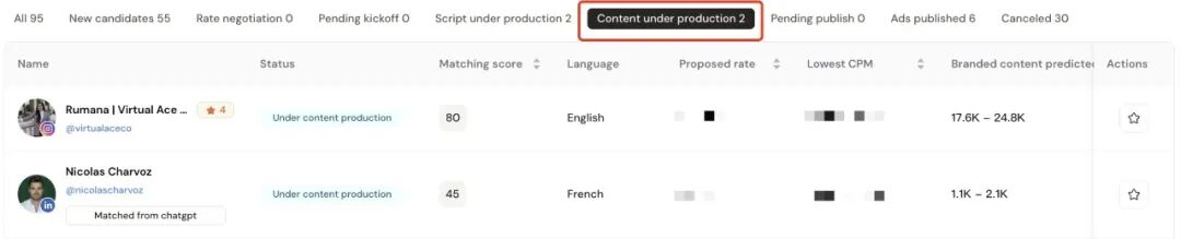 在48小时之内,AhaCreator匹配到的达人,会陆续“接单”。在一个面板上,会展示多少达人接单,多少达人需要进一步“价格谈判”,最终有合作意向的是几个达人等。