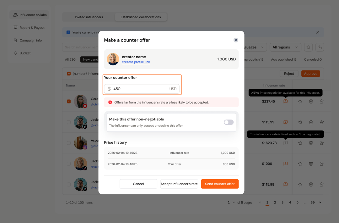 如果我们觉得这个达人值得合作,那么可以点击“确认合作”(deal confirmed)。如果我们觉得达人的价格不适合,可以通过AhaCreator的“议价”功能,在后台输入”预期价格”,由AI带着这个价格跟达人沟通,直至达成协议,而无需像以前那样逐个发邮件跟达人反复磋商,费时费力。