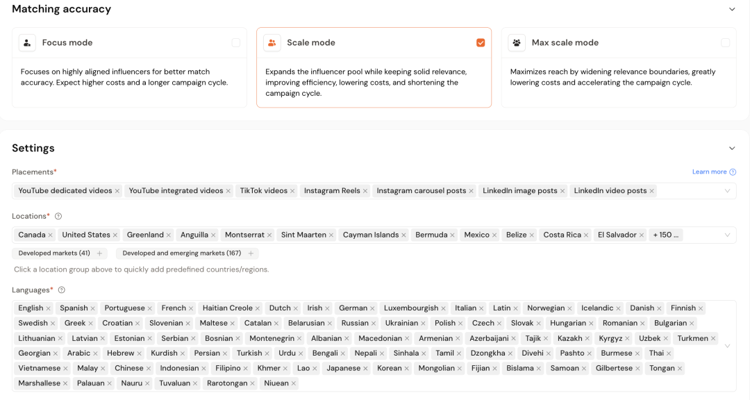 第二步,达人设置。要先设置达人匹配逻辑,有3种模式,不同的匹配模式,会决定推广活动的精准度和覆盖范围,包括聚焦模式(Focus mode)、扩展模式(Scale mode)、最大扩大模式(Max scale mode)。此外,可以设置“内容类型”“投放平台”“地域”“语言”等,如果我们想修改,随时可以人工介入,随时“增删改查”。