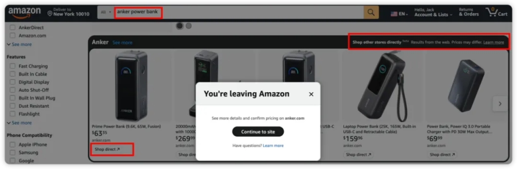 二、“接入”独立站,推出“Shop Direct”(直接购买)功能,让消费者在站内搜索、购买到“在亚马逊暂未上架、但独立站有售”的商品,以应对ChatGPT接入沃尔玛、Etsy之后商品丰富度大增的竞争局面。
