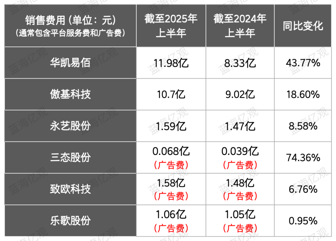 类似的情况,在其他跨境上市大卖家中也能看到。2025年上半年,三态股份、致欧科技、乐歌股份等上市大卖家的广告支出,分别同比上涨了74.36%、6.76%、0.95%。