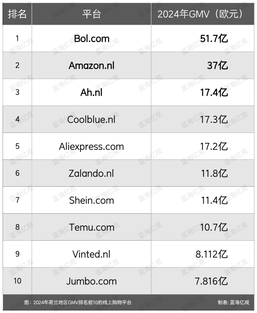 据欧洲商业理事会(ECDB)数据显示,2024年荷兰消费者在Bol的消费总额约为51.7亿欧元,位居第一,其次为亚马逊荷兰站(37亿欧元),而速卖通、SHEIN和Temu三个平台合计约38.6亿欧元。