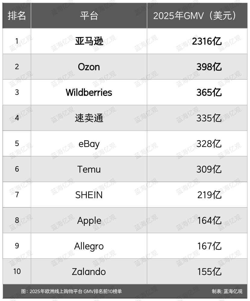 据欧洲电商数据库ECDB数据显示,2025年亚马逊在欧洲市场的GMV总规模,就已经超过2000亿欧元,远超Ozon、eBay、Temu、SHEIN等。