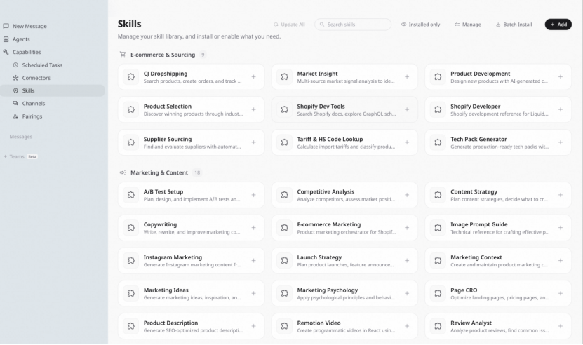 为此,Accio Work特别定制了“电商专家”“网店运营”“一件代发货”等多个专业Agent,并面向生意领域定制了大量专用“技能包”(skills),覆盖电商与供应链、营销与内容创作、研究与洞察、金融与财务等多个领域。