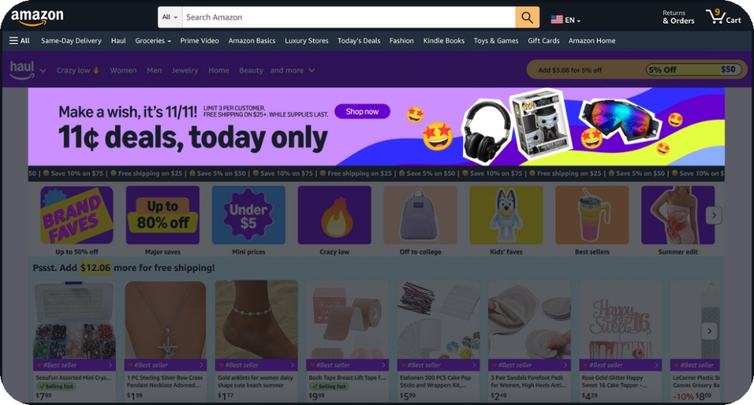折扣与优惠,当然是Haul与Bazzar的主打牌,这一点,跟其他主打性价比的平台,差异不大。然而,Haul与Bazzar带着亚马逊良好的品牌信任度、成熟的物流体系入场,给市场带来新的变量。