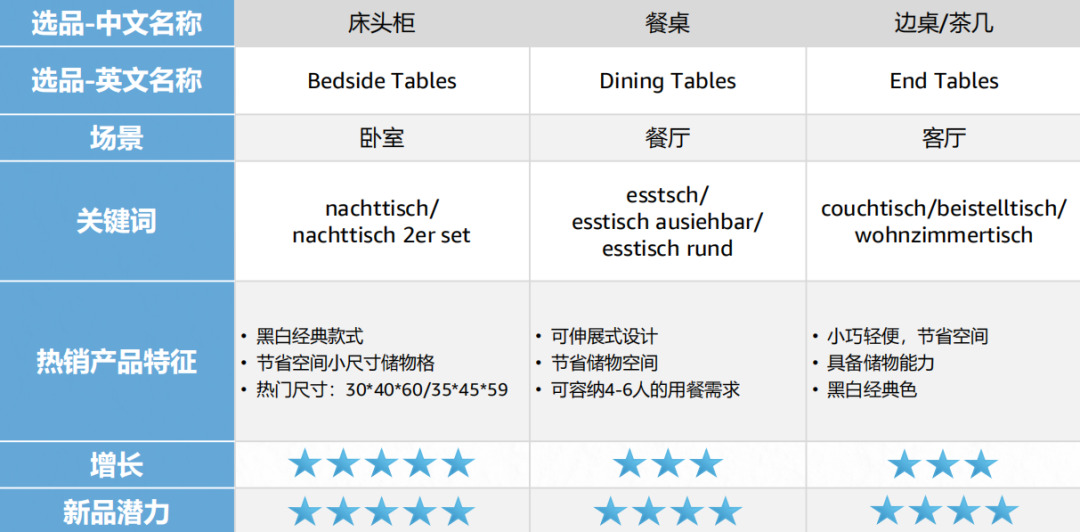 欧洲市场侧重小空间和精准功能。选窄型抽屉、小型折叠餐桌,贴合紧凑家居环境;材质优先实木、藤条等天然的,功能不用多复杂,带储物的智能床头柜、可伸展餐桌就很受欢迎,价格盯紧40-500美元区间。