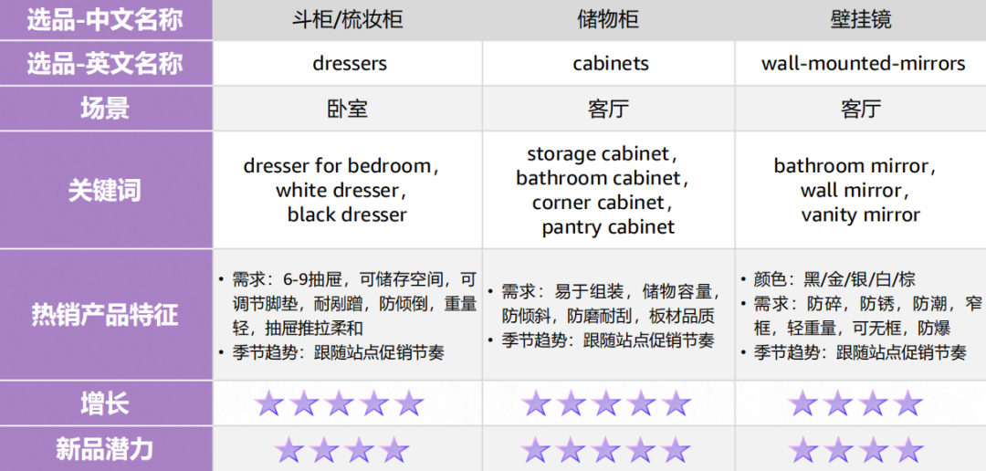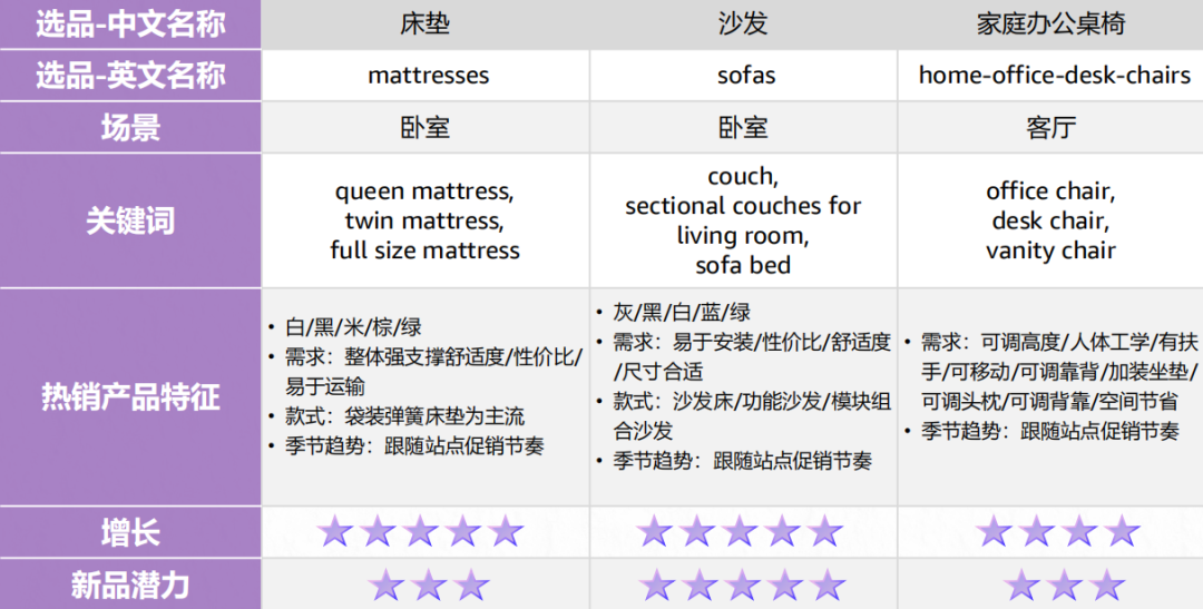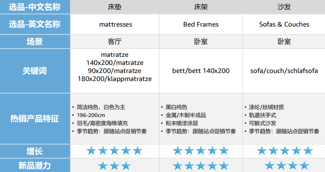 床垫推记忆棉、冷却凝胶控温款,折叠款需求有市场空白;沙发做带储物的优质沙发床、可定制模块化款。储物家具选木质纤细抽屉单元、跨房间能用的多功能边柜。办公椅适配不同体型,带LED灯、USB的智能床头柜等等,这些产品都有较大的溢价空间。
