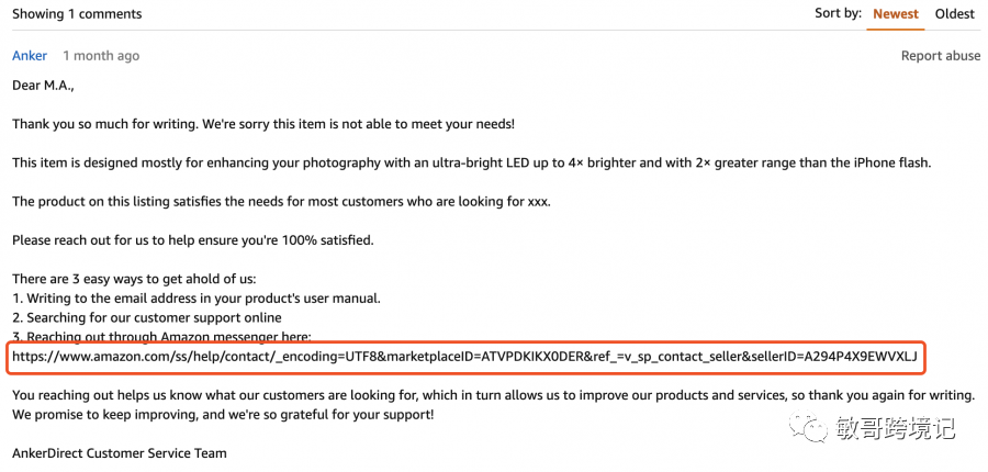 比如说我前两天在小圈子内给大家分享的ANKER案例中的review回复引导,从细节上去引导客户主动联系自己,给客户提供比较好的解决方案,从而增大差评的删除概率。具体的操作手法如下: